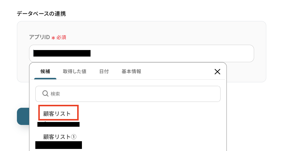 データベース連携の「アプリID」には、スマレジの取引情報を追加するkintoneのアプリを指定します。