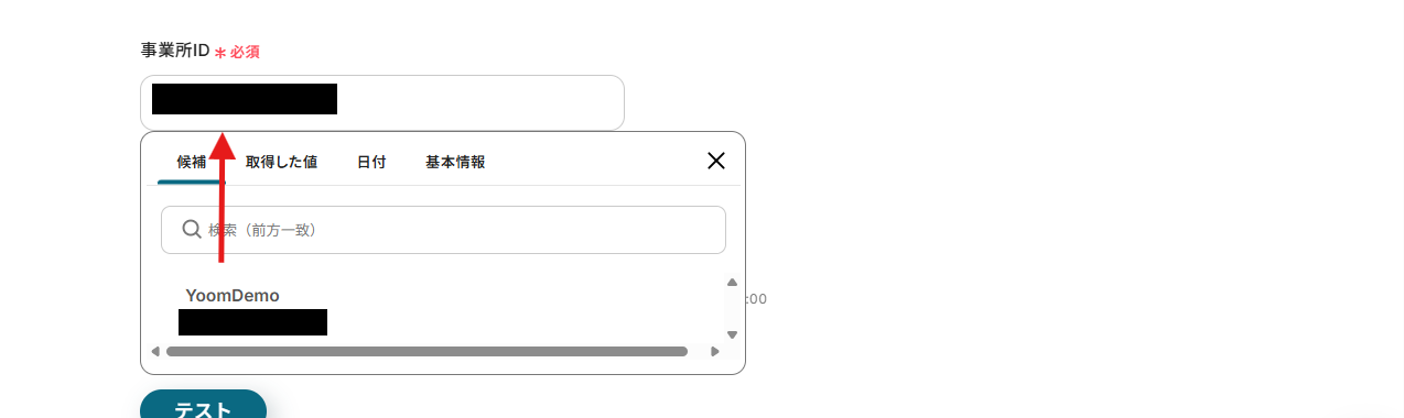 事業所IDは、枠内をクリックすると先ほど連携したスマレジ・タイムカードに登録してある事業所が候補に表示されるので、使用したいものを選択しましょう。