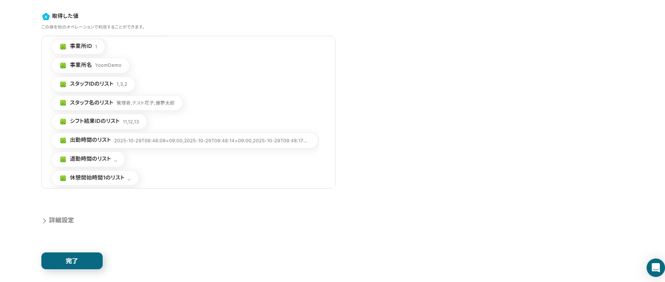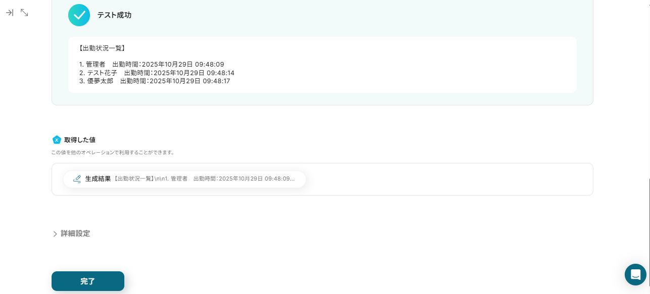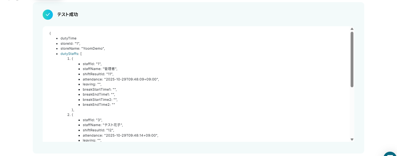 テストを実行し、テストが成功すると、スマレジ・タイムカードの出勤中従業員情報が取得した値に表示されます。