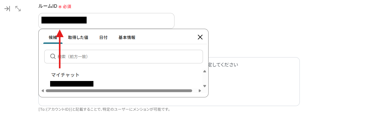 ルームIDは、枠内をクリックすると先ほど連携したChatworkのルームが候補に表示されるので、使用したいものを選択しましょう。