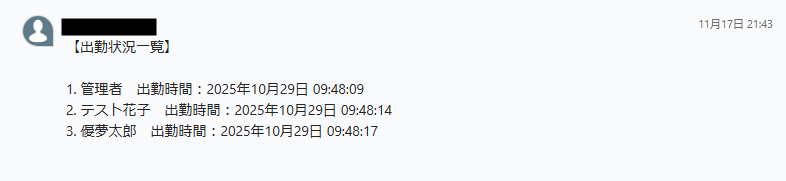 - スケジュールに合わせてスマレジ・タイムカードの出勤情報を自動で取得・通知するため、手作業での確認や報告業務に費やしていた時間を短縮できます。