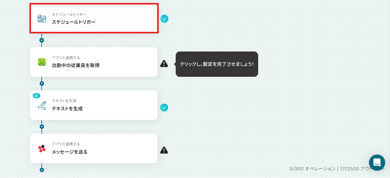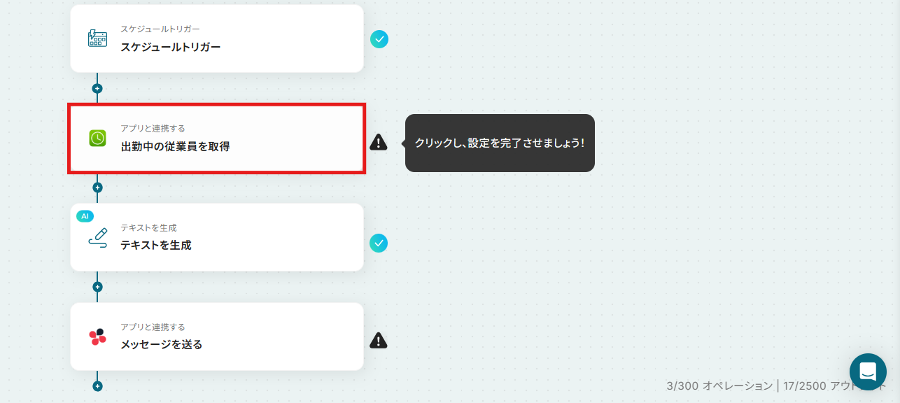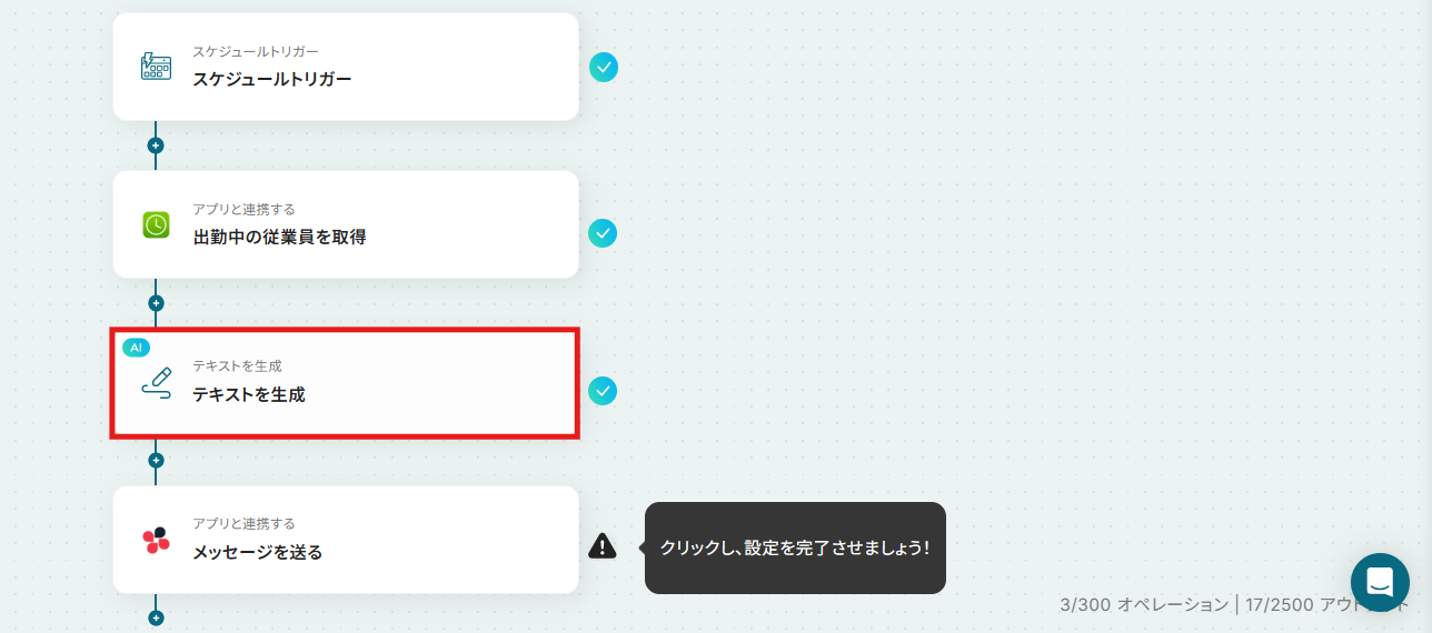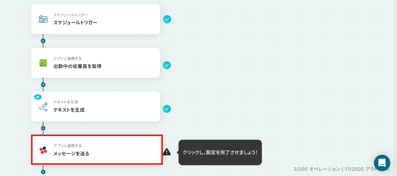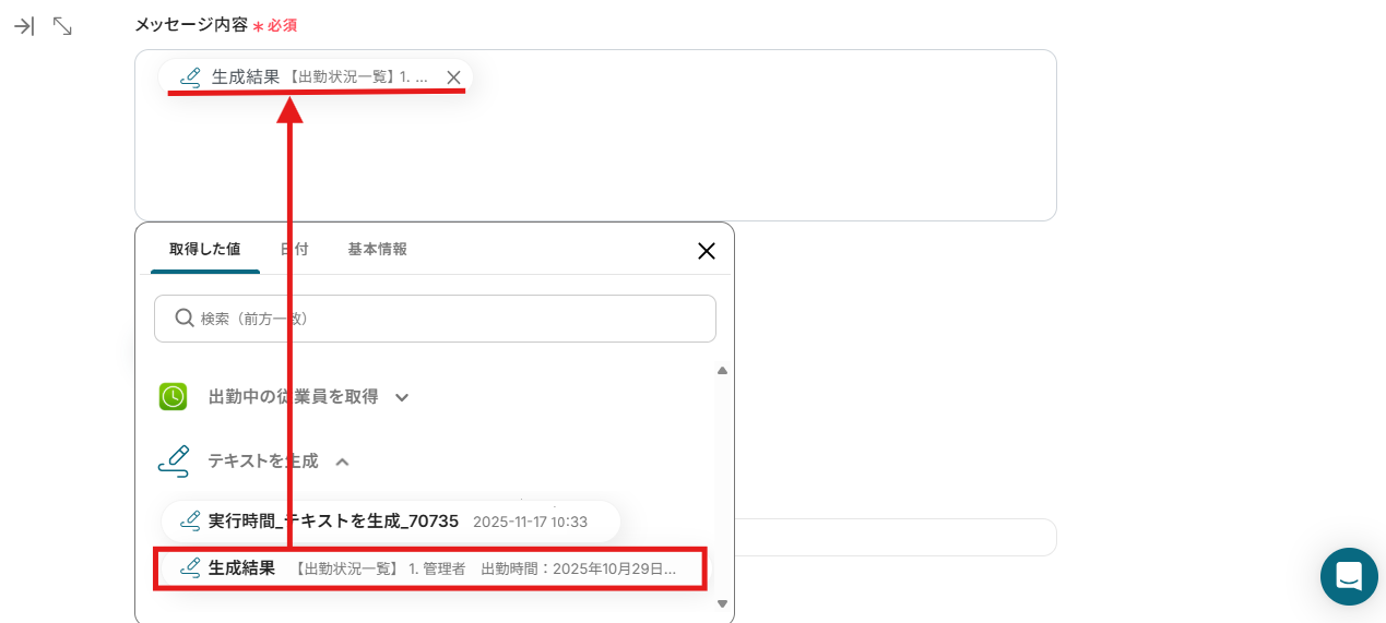 最後に、スマレジ・タイムカードの出勤中従業員情報から作成した生成結果をChatworkに自動でメッセージを送る設定を行います。