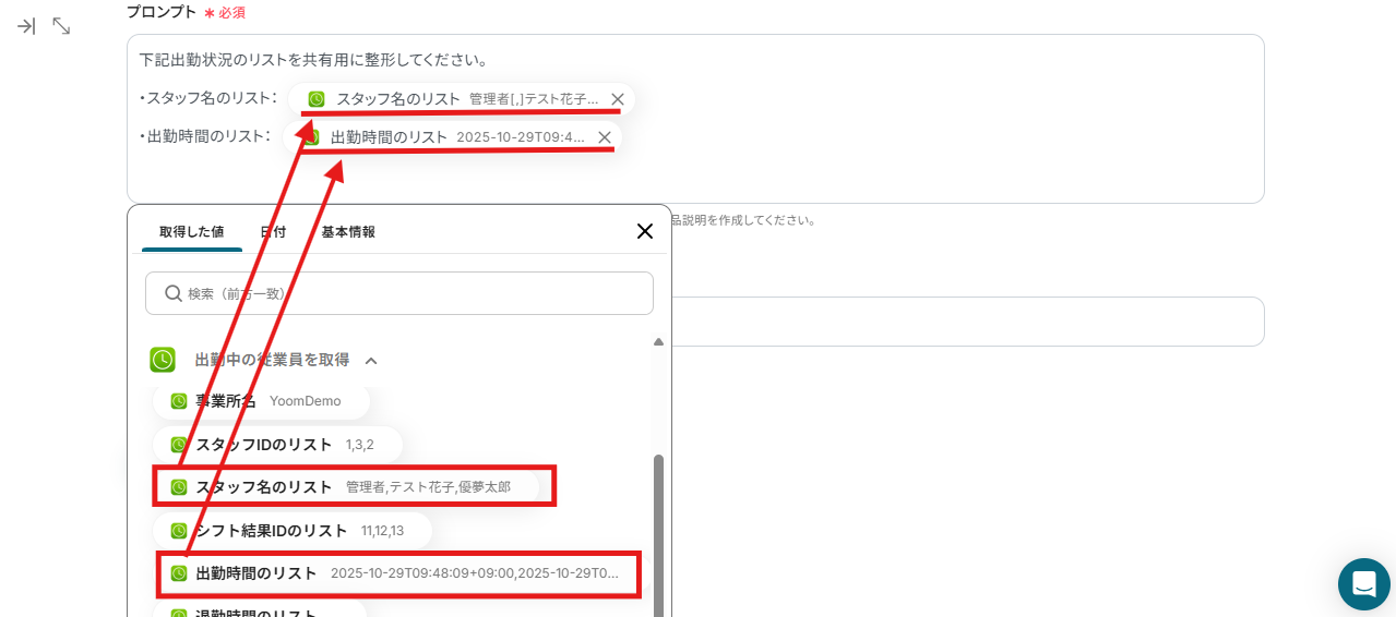 例えば、下記画像のように取得した値を使用し設定することで、「スタッフ名のリスト」と「出勤時間のリスト」を自動的に取得し、出勤状況のリストを生成するためのプロンプトとして設定することが可能です。