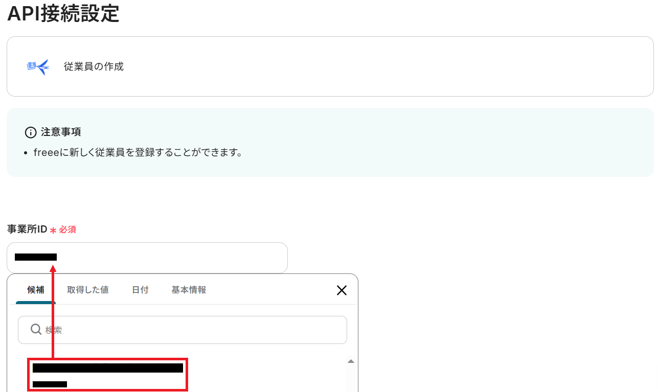 API接続設定に移るので、まず事業所IDを候補から選択しましょう。