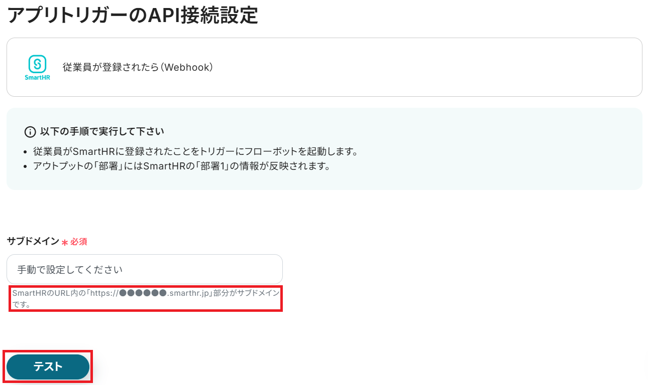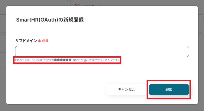 サブドメインを入力してください。テキストボックス下部の説明通り、SmartHRのURL内の「https://●●●●●●.smarthr.jp」部分がサブドメインです。