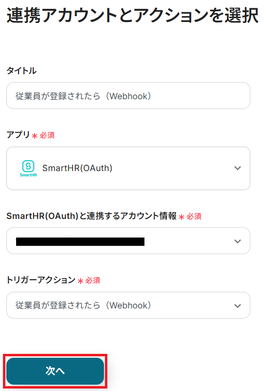 タイトルと連携するアカウント情報を任意で設定し、トリガーアクションはテンプレート通りに「従業員が登録されたら(Webhook)」のまま「次へ」をクリックします。