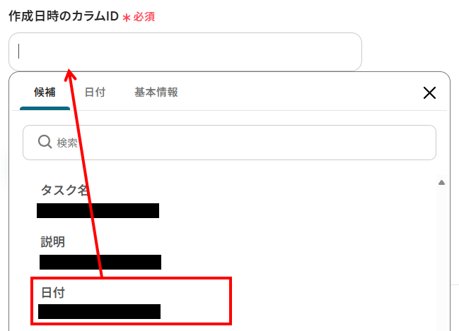 - 作成日時のカラムID:こちらも入力欄をクリックして、作成日時を選択しましょう。