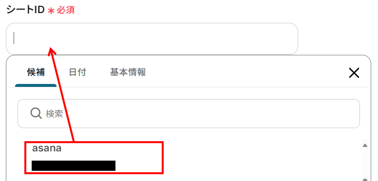 - シートID:入力欄をクリックすると下記のように候補が表示されます。先ほど作成したシートを選択してください。