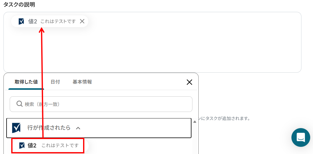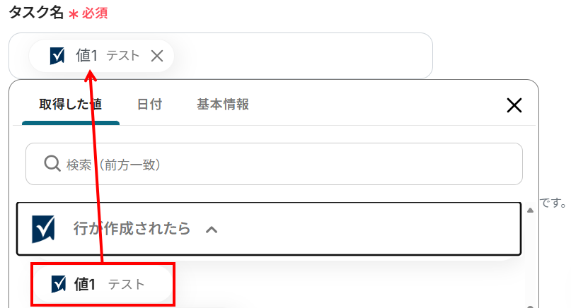 - タスク名:入力欄をクリックすると、下記のように取得した値が表示されます。今回は、Smartsheetで取得した値から項目を選択しましたが、運用したい内容にあわせ自由に設定してください。
