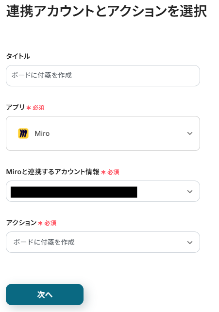 先ほどと同様にタイトルと連携するアカウント情報を任意で設定し、アクションはテンプレート通りに「ボードに付箋を作成」のまま「次へ」をクリックして進んでください。