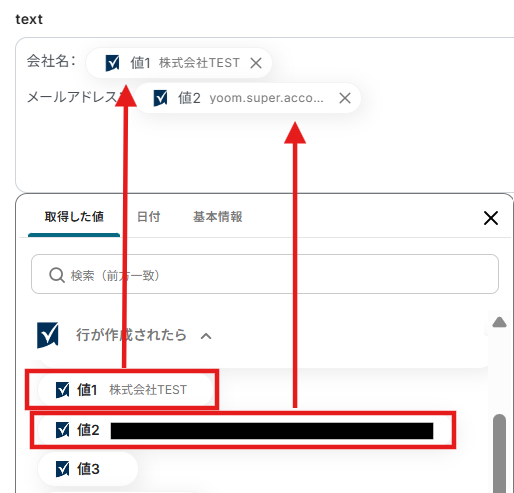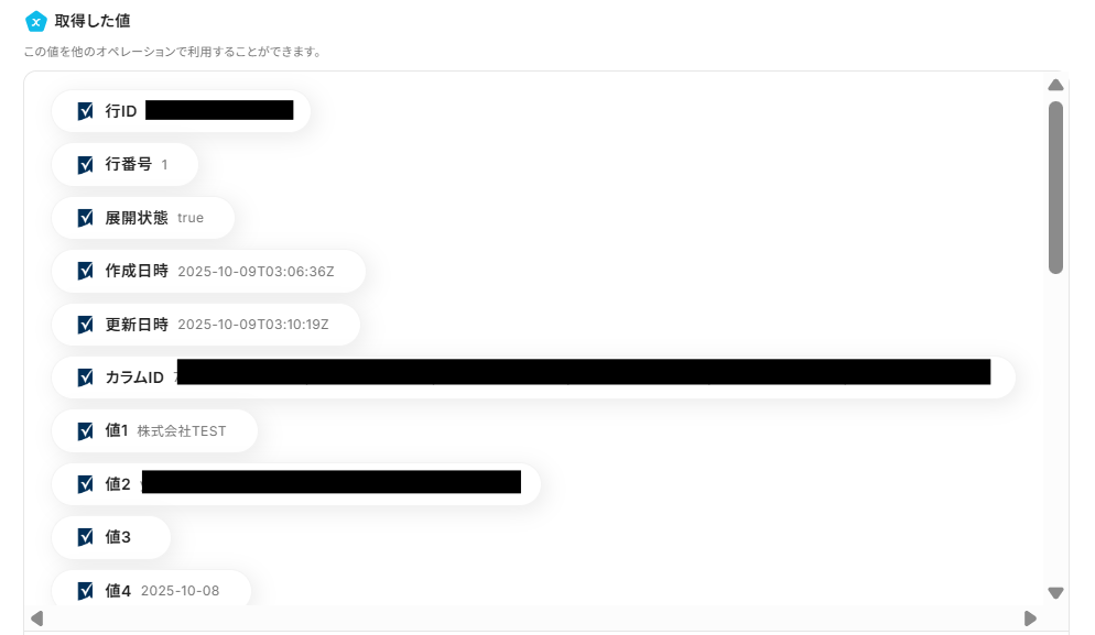 トリガーやオペレーション設定時に、「テスト」を実行して取得した値のことを指します。