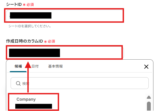 4.「シートID」と「作成日時のカラムID」は入力欄をクリックし、候補から入力しましょう。