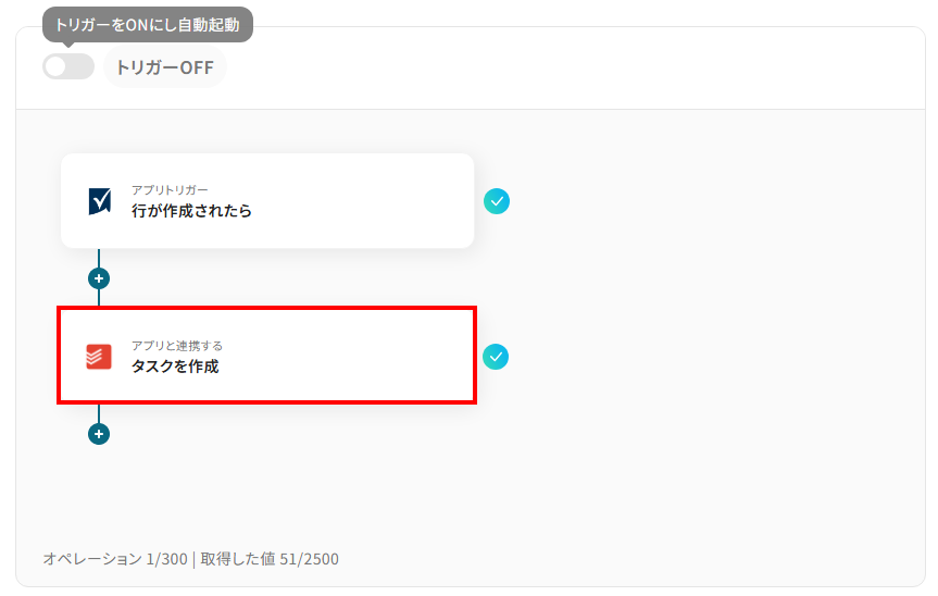続いて、Smartsheetから取得したデータを用いて、Todoistでタスクを作成する設定をしましょう。まずは、下記赤枠をクリックしてください。