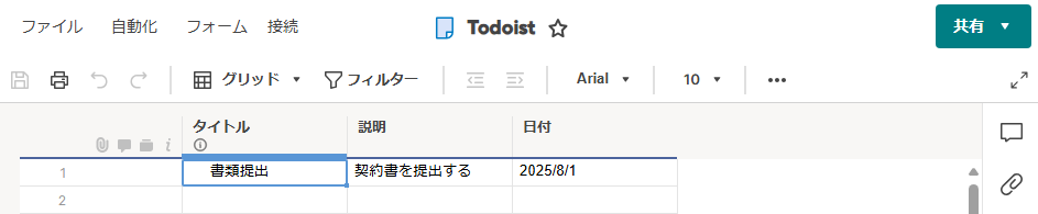 この後のテスト操作のために、カラムに日付を作成し、テスト用に行を1つ追加してください。