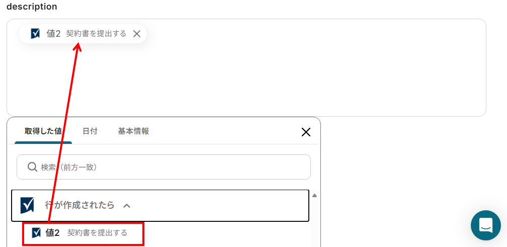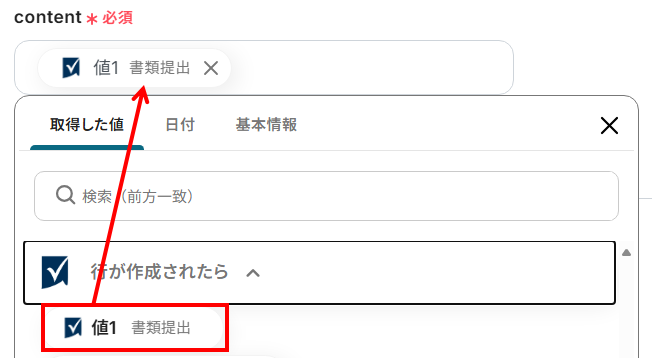 - content:入力欄をクリックすると、前のステップでSmartsheetから取得したアウトプットを選択できます。