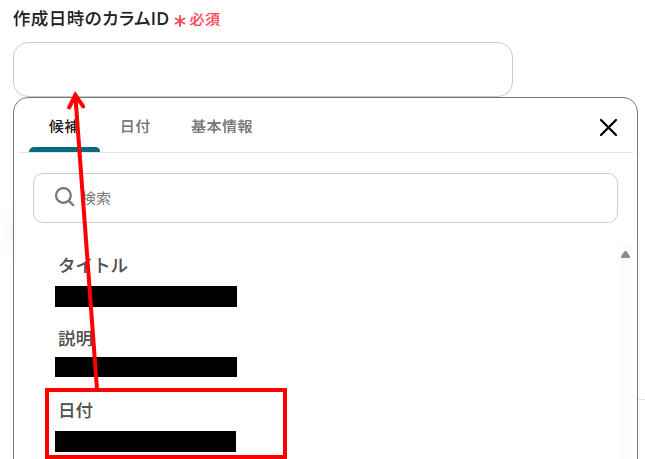 - 作成日時のカラムID:こちらも入力欄をクリックして、作成日時を選択しましょう。