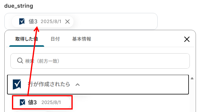 - due_string:こちらには下記のように日付のアウトプットを選択しました。