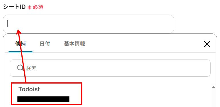 - シートID:入力欄をクリックすると下記のように候補が表示されます。先ほど作成したシートを選択してください。