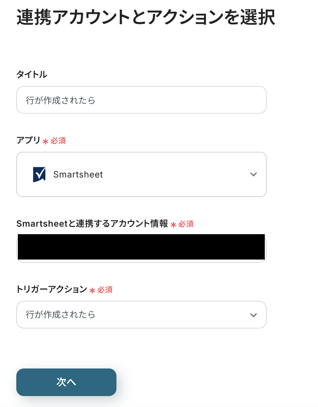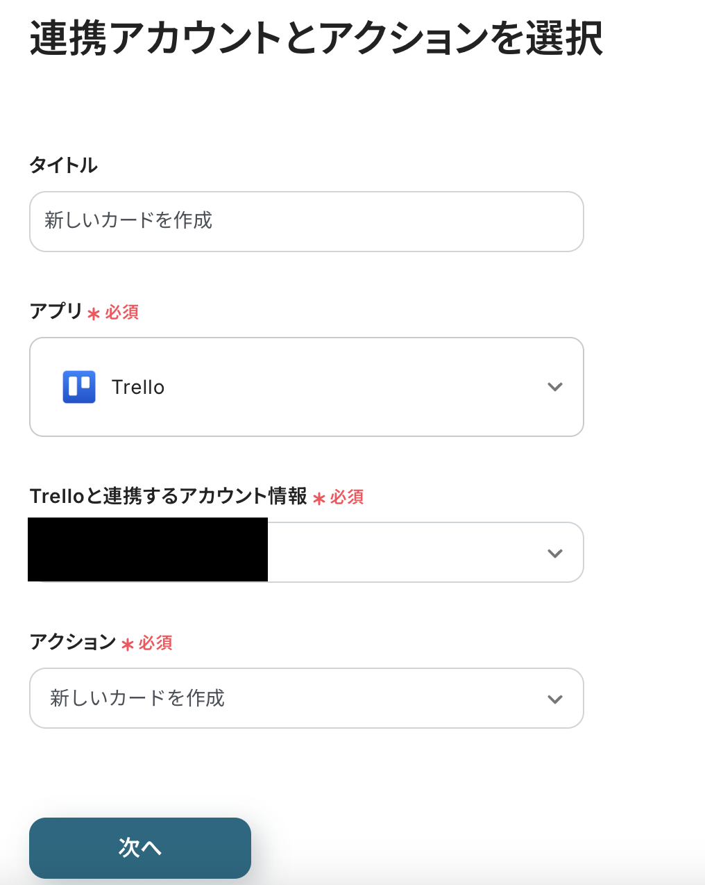 連携アカウントとアクションを選択する画面は、以下を確認して次へをクリックしましょう。