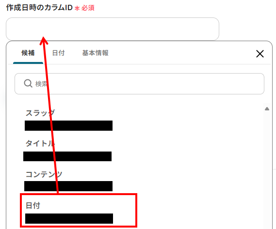- 作成日時のカラムID:こちらも入力欄をクリックして、作成日時を選択しましょう。