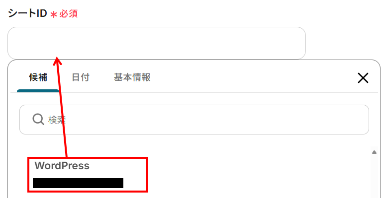 - シートID:入力欄をクリックすると下記のように候補が表示されます。先ほど作成したシートを選択してください。