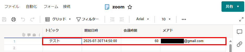 なお、下記赤枠のように会議時間を「60」と入力したにもかかわらず「60.0」とアウトプットされてしまいますが、これはSmartsheetのAPIの仕様です。