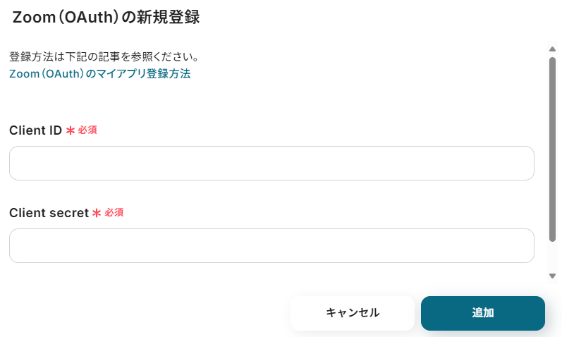 Client ID、Client secretを入力し、「追加」をクリックします。Client IDとClient secretの取得方法はこちらをご確認ください。