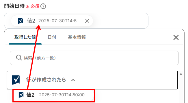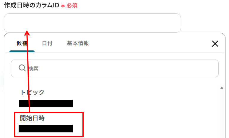 - 作成日時のカラムID:こちらも入力欄をクリックして、開始日時を選択しましょう。