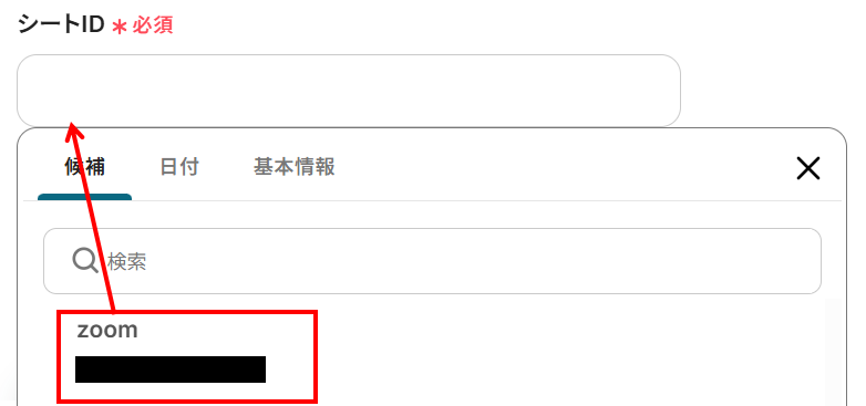 - シートID:入力欄をクリックすると下記のように候補が表示されます。先ほど作成したシートを選択してください。