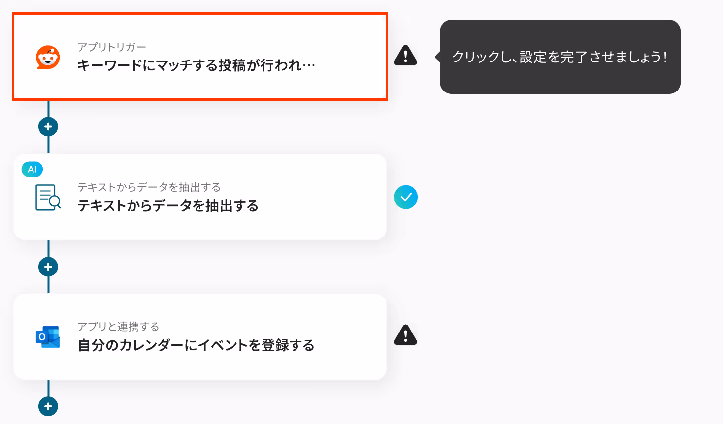 ここから「Redditでキーワードにマッチする投稿が行われたら、Outlookにイベントを登録する」フローの設定をしていきます!