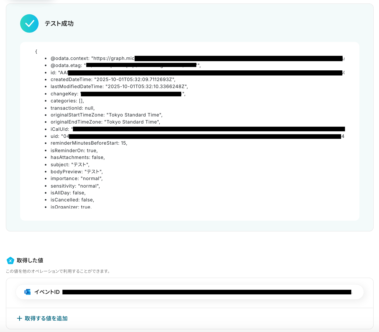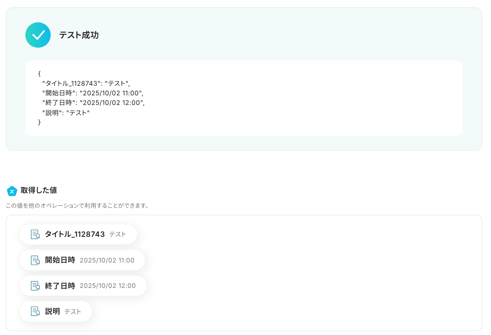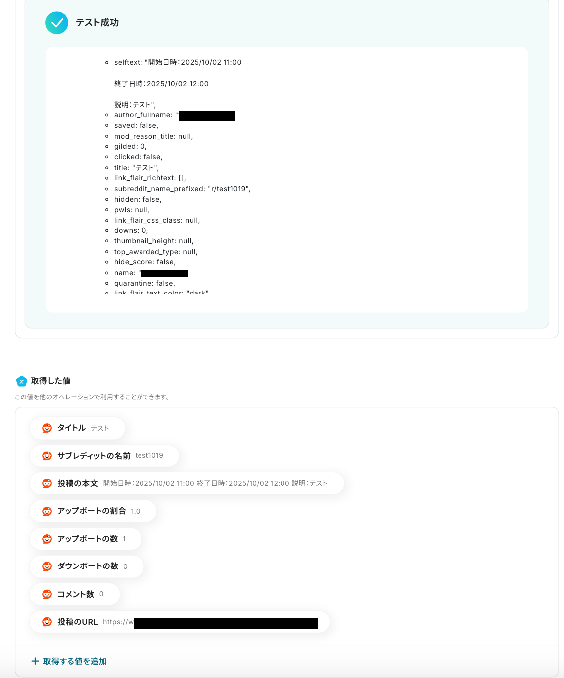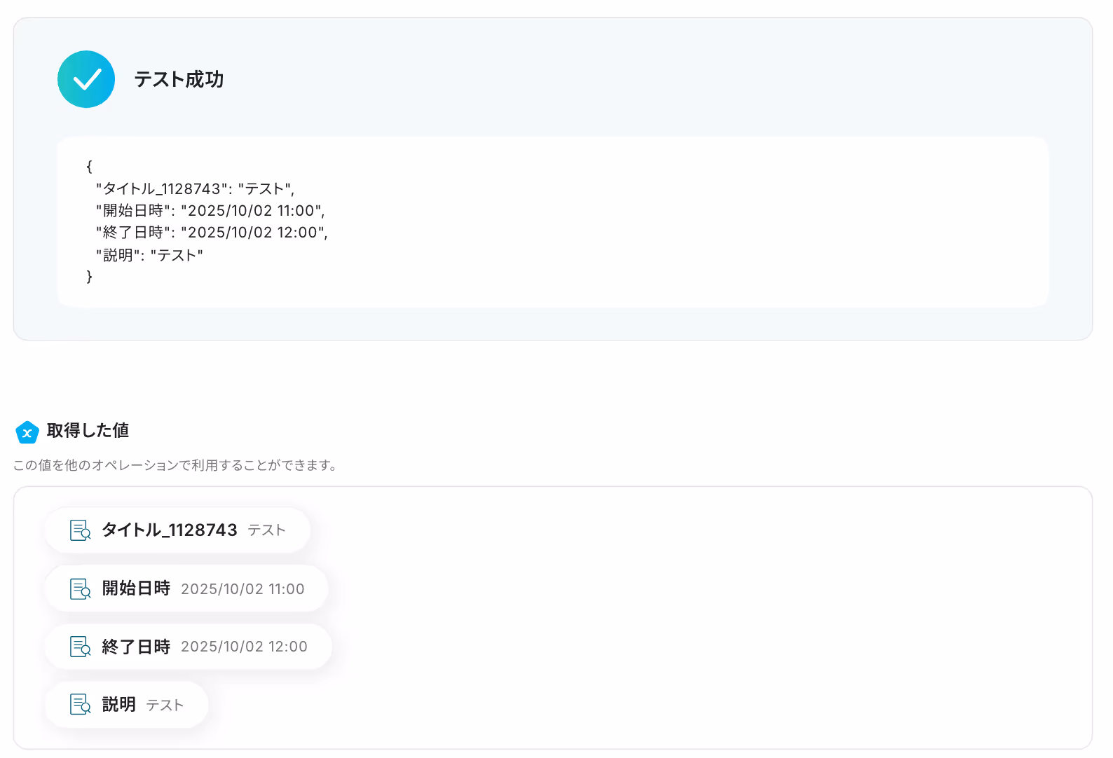投稿後、Yoomの画面に戻り、「テスト」を実行しましょう。テストが成功すると、取得した値が表示されます。