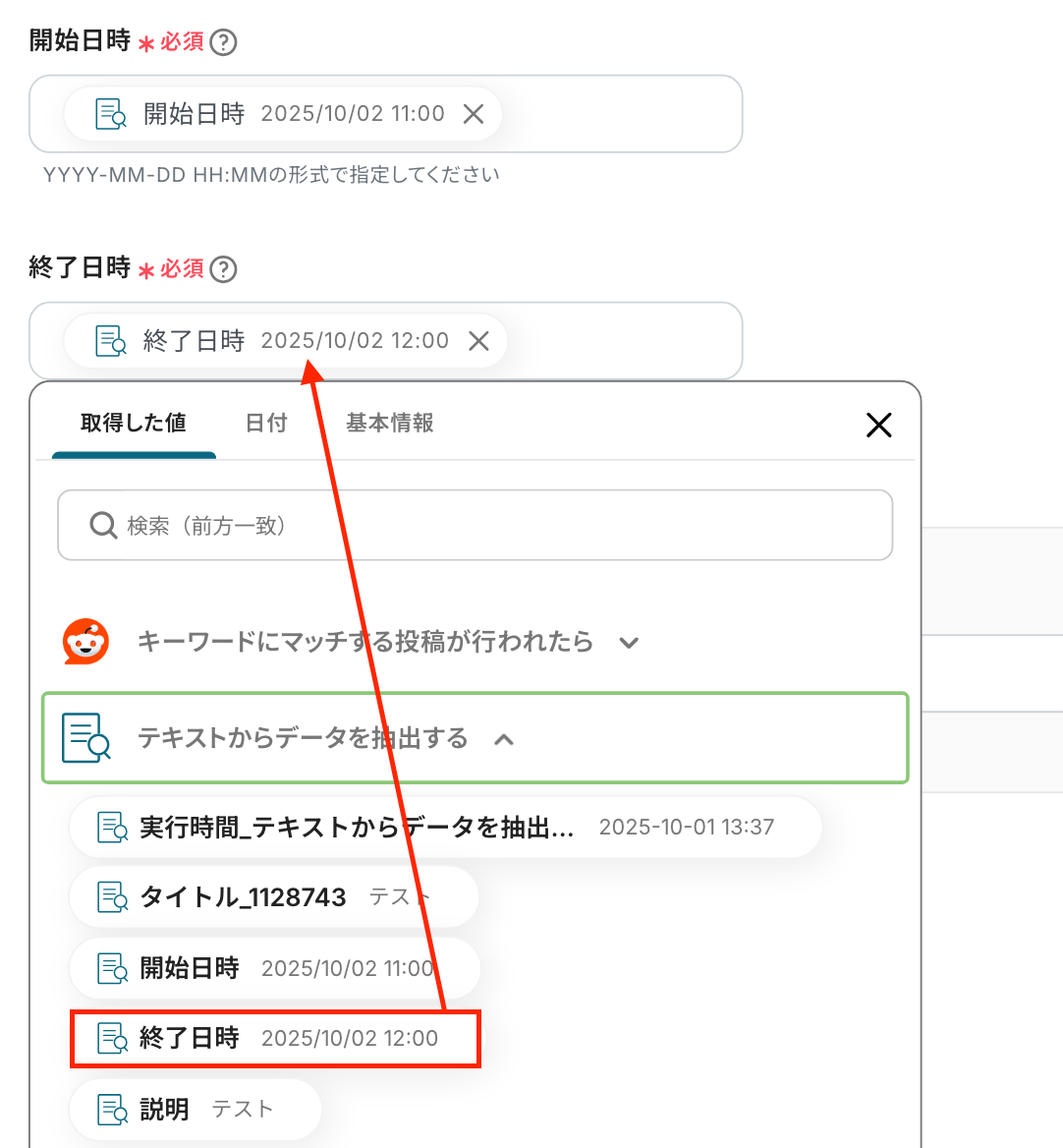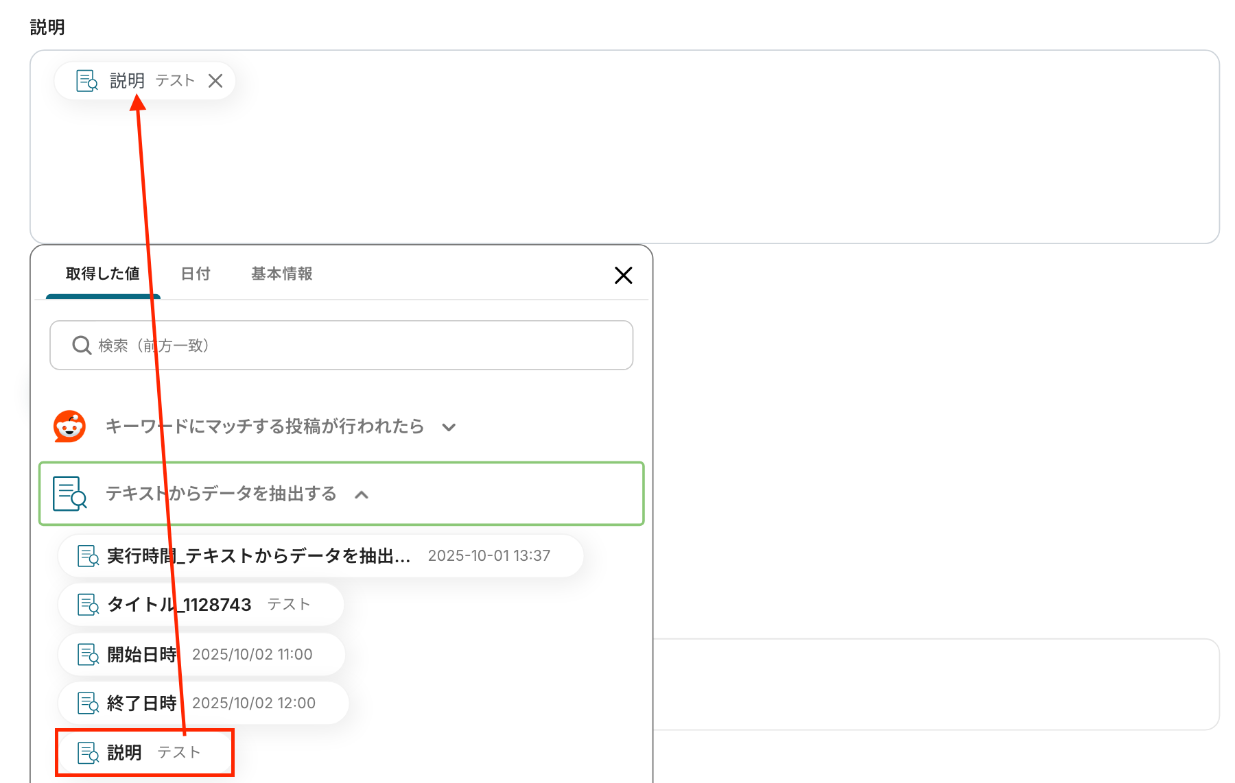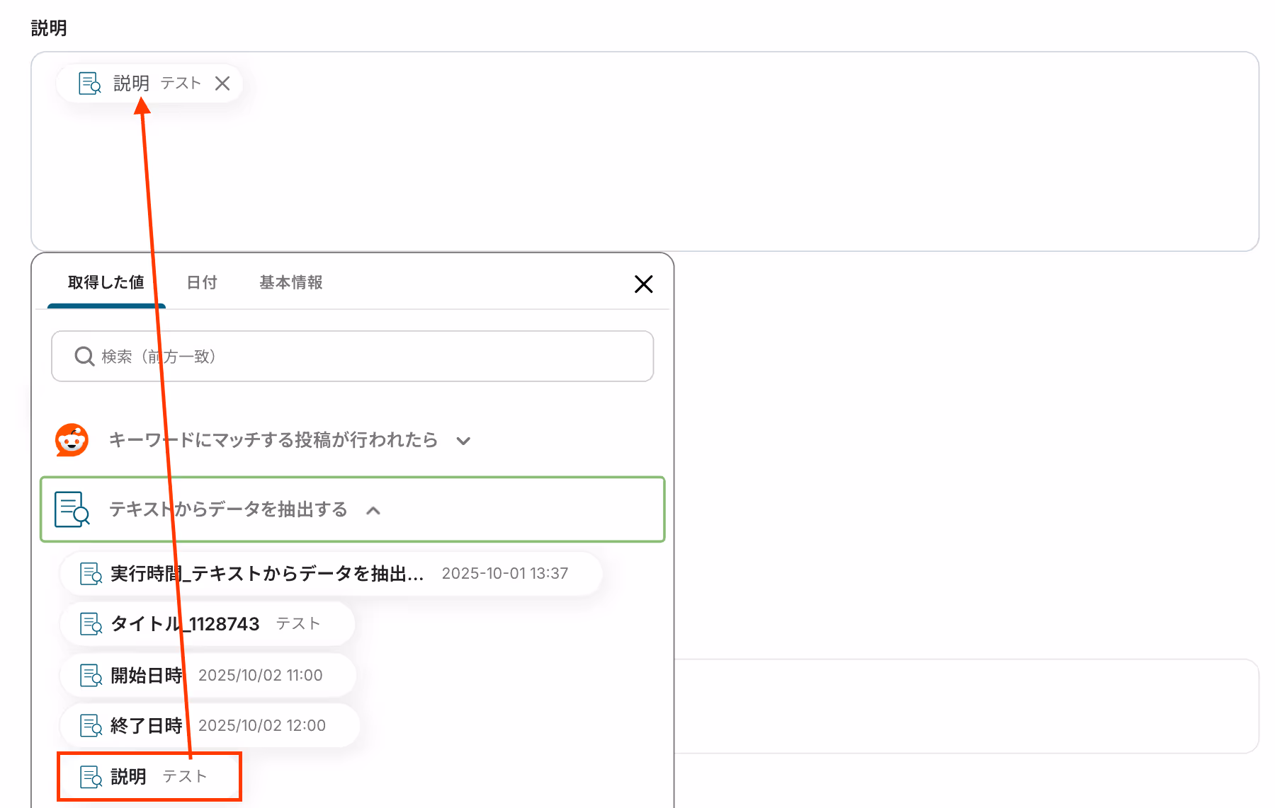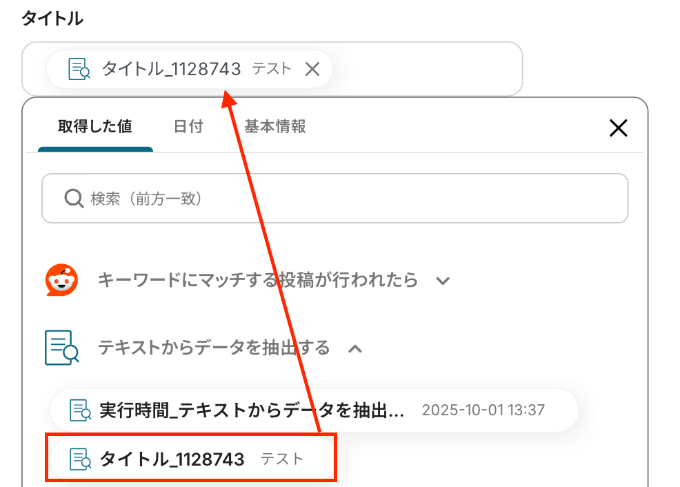 先ほどRedditのトリガー設定で取得した値からデータを抽出する設定を行います。