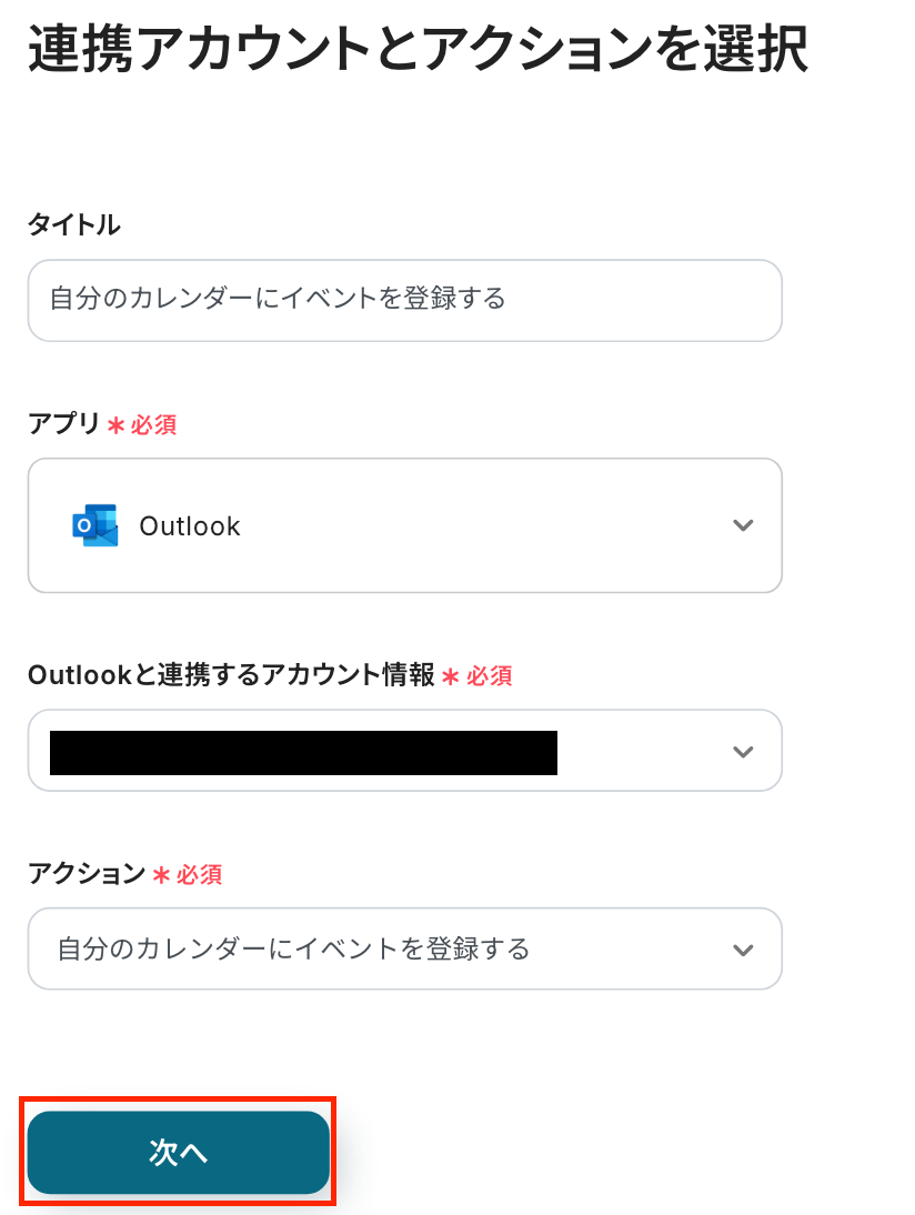 タイトルを任意で修正し、連携するアカウント情報が合っているか確認します。