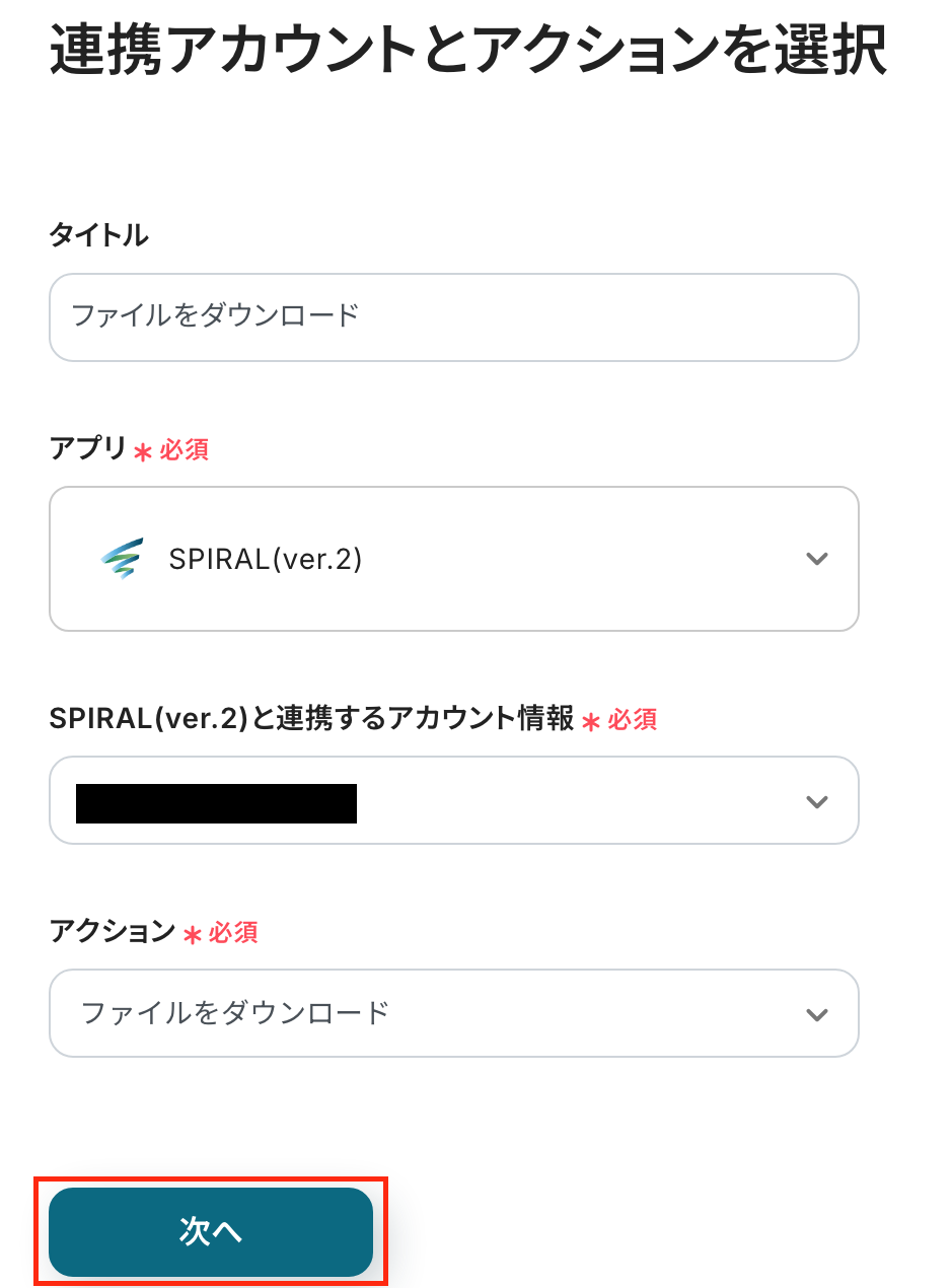 タイトルと連携するアカウント情報を設定し、アクションはテンプレート通りのまま「次へ」をクリックして進んでください。