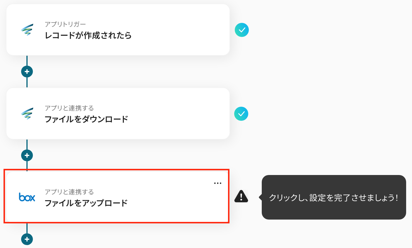 以上で、「SPIRALでレコードが作成されたら、対象のデータベースにある関連ファイルをBoxにアップロードする」フローの完成です!