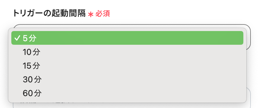 トリガーの起動間隔は、5分・10分・15分・30分・60分から選べます。