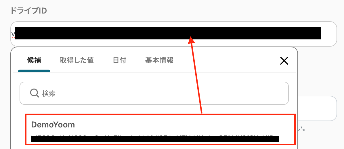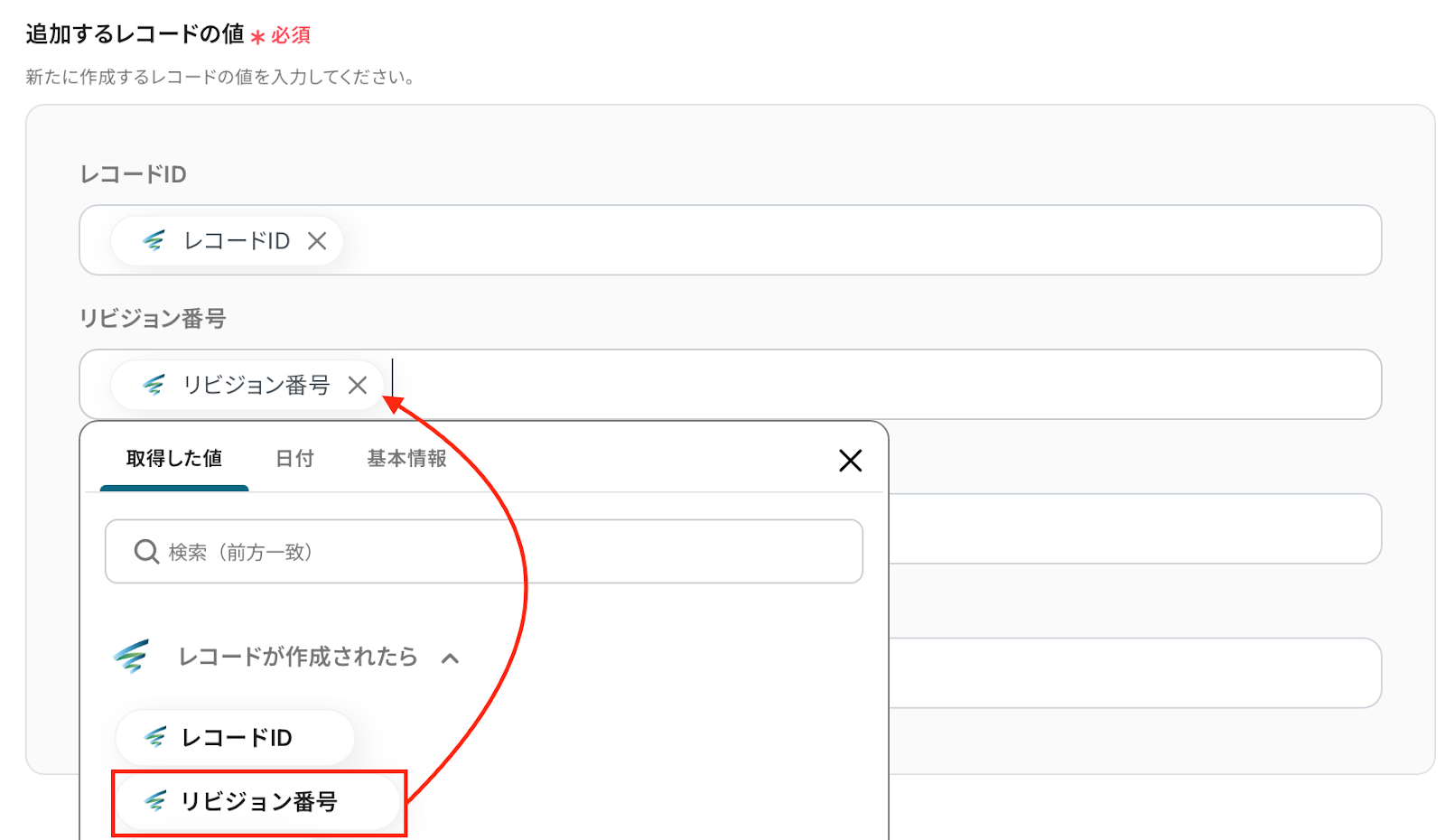 下記画面のように、欄をクリックすると前ステップで取得した値が表示されるため、該当するものをクリックして設定してください。