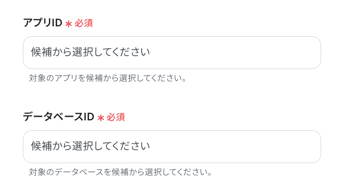 「アプリID」と「データベースID」は、入力欄をクリックすると連携しているアカウントに紐づいた候補が表示されるので、候補からフローで使用する該当のアプリ、データベースを選択してくださいね!