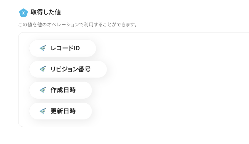 テストが成功すると、作成したレコードの情報が「取得した値」にアウトプットとして抽出されます。内容を確認し、「保存する」を押して次の設定に進みましょう!