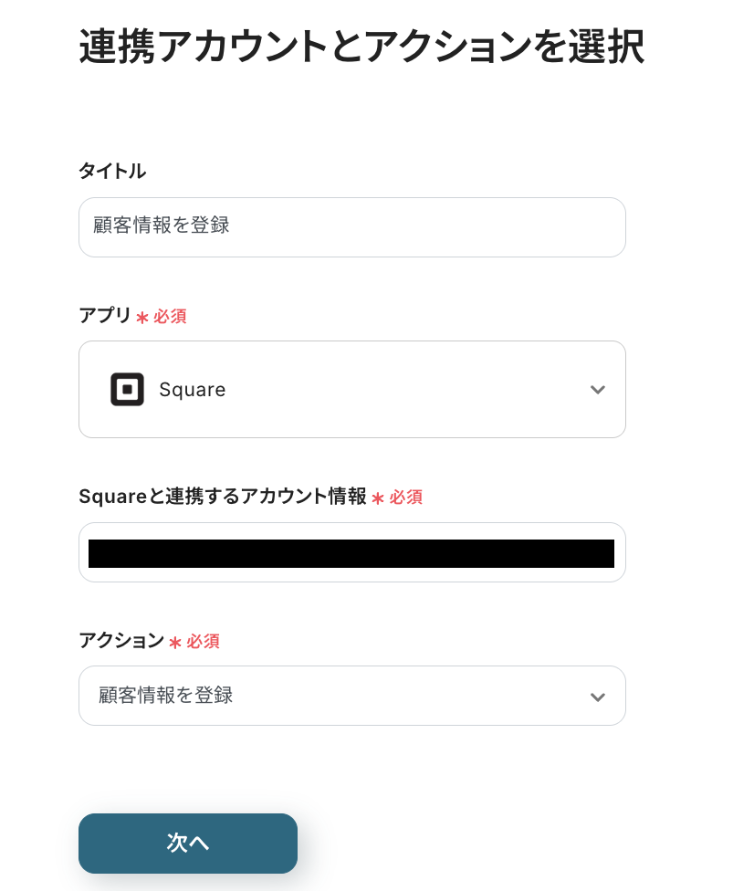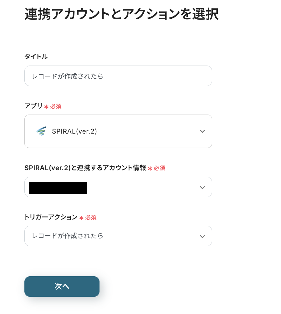 タイトルと連携するアカウント情報を設定し、アクションはテンプレート通りのまま「次へ」をクリックして進んでください。