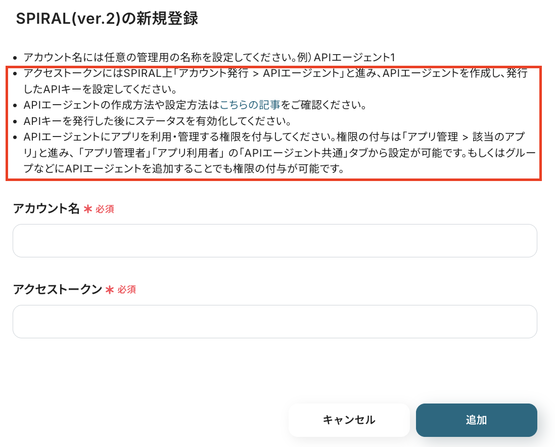 新規登録画面が表示されるので「アカウント名」と「アクセストークン」を入力し、「追加」を押したら連携完了です!