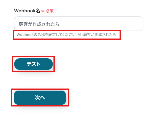 次の画面で、「Webhook名」を入力欄下の説明に従って、入力してください。
