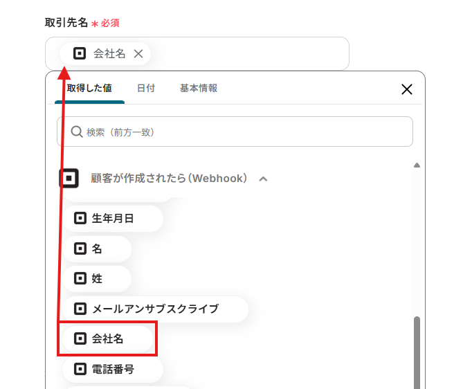 「取引先名」は、入力欄をクリックして表示されるアウトプット(取得した値)から選択できます。