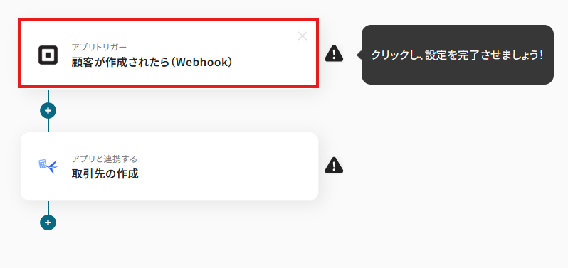 先ほどの画面で「OK」をクリックして、表示された画面のアプリトリガー「顧客が作成されたら(Webhook)」をクリックしましょう。
