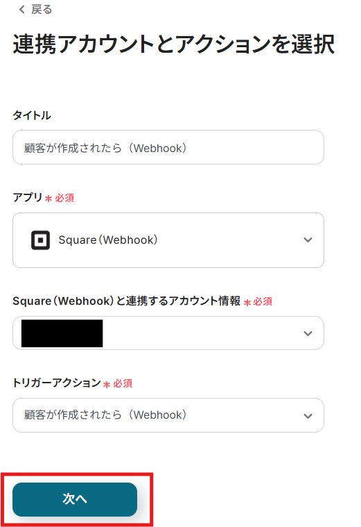 トリガーアクションは、「顧客が作成されたら(Webhook)」のままで次に進みましょう!