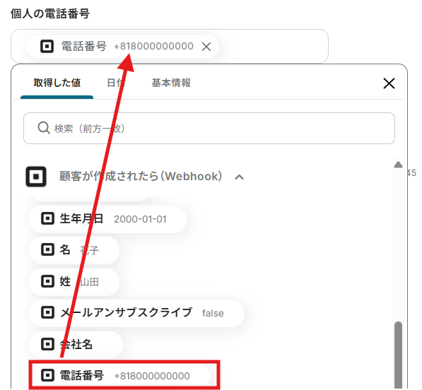 対応する値を変更または追加する場合は編集欄を選択し、「顧客が作成されたら(Webhook)」から、Squareで作成した顧客情報を選択して引用できます。