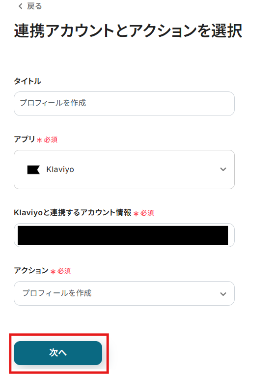 Squareと同様に、ステップ1でマイアプリ連携したKlaviyoのアカウント情報が自動で表示されます。