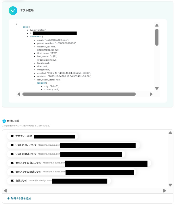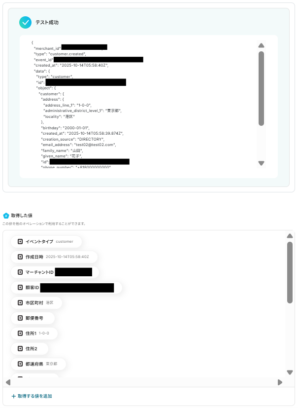 テストに成功すると、取得した値の各項目の横に、Squareで作成した顧客の詳細情報が表示されます。