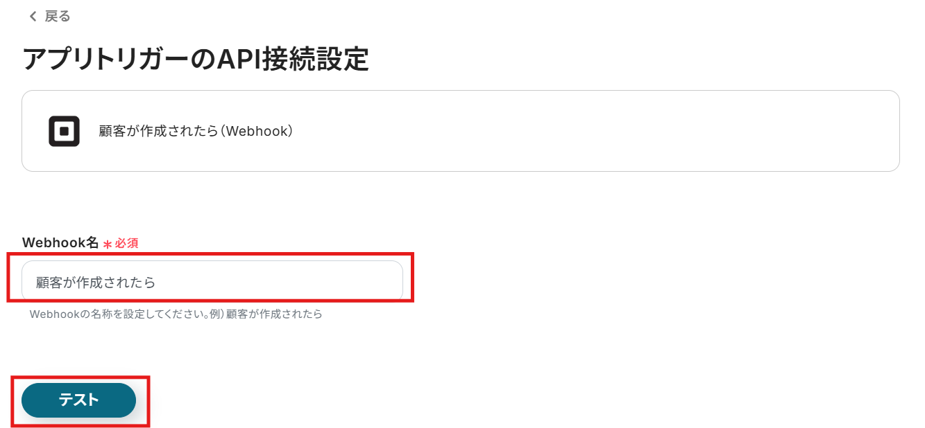 これから設定するWebhookの名前を任意で入力し、テストを実行してください。