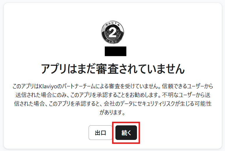 ログインすると下記の画面が表示されるので、「続く」をクリックします。